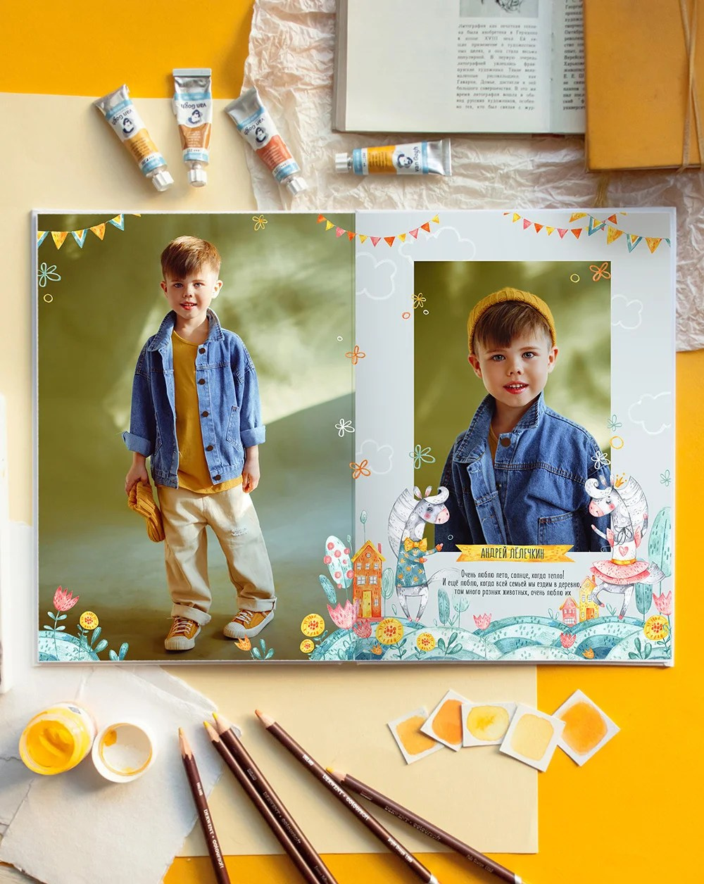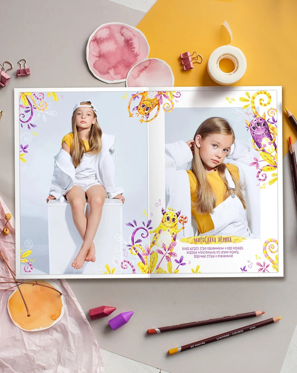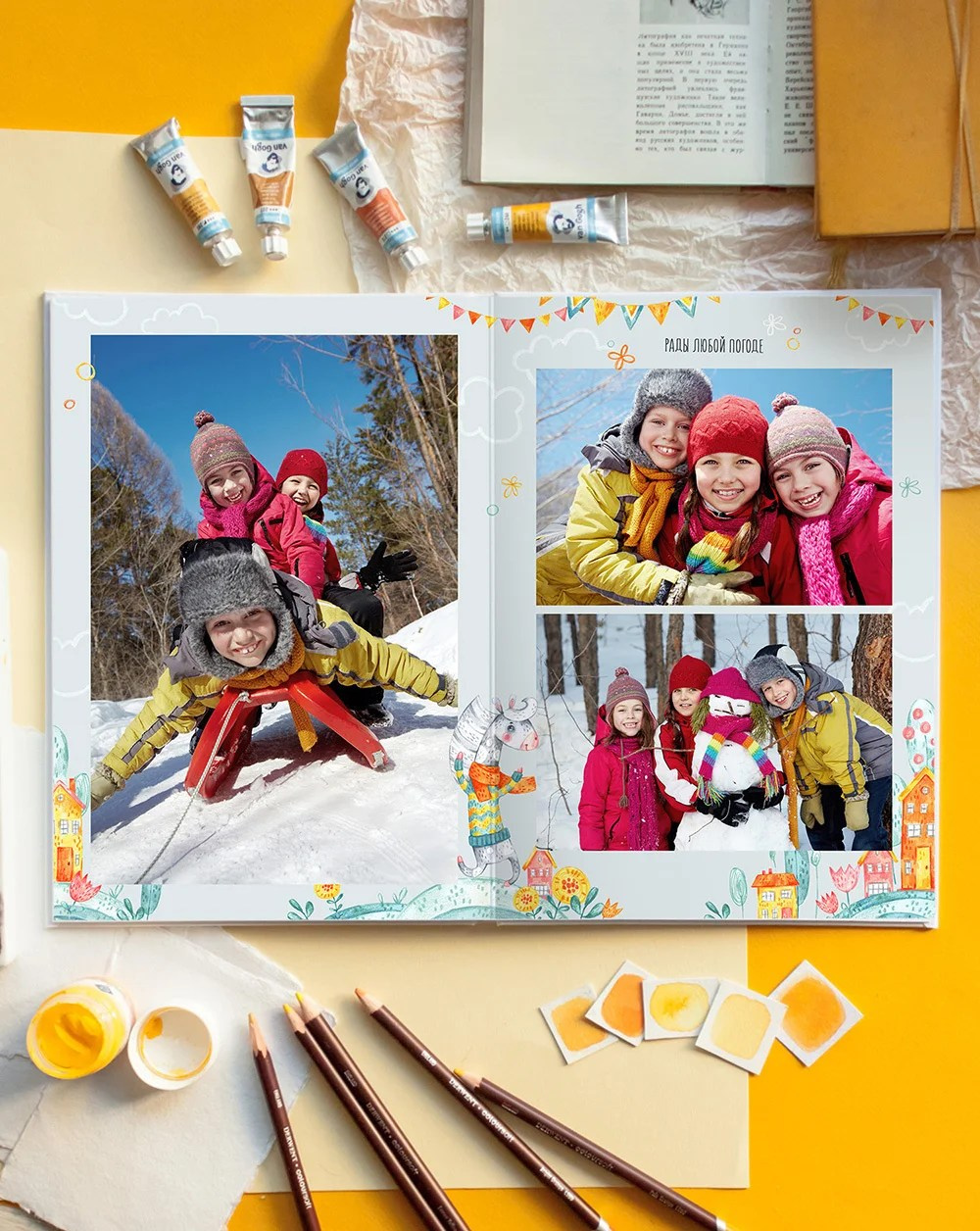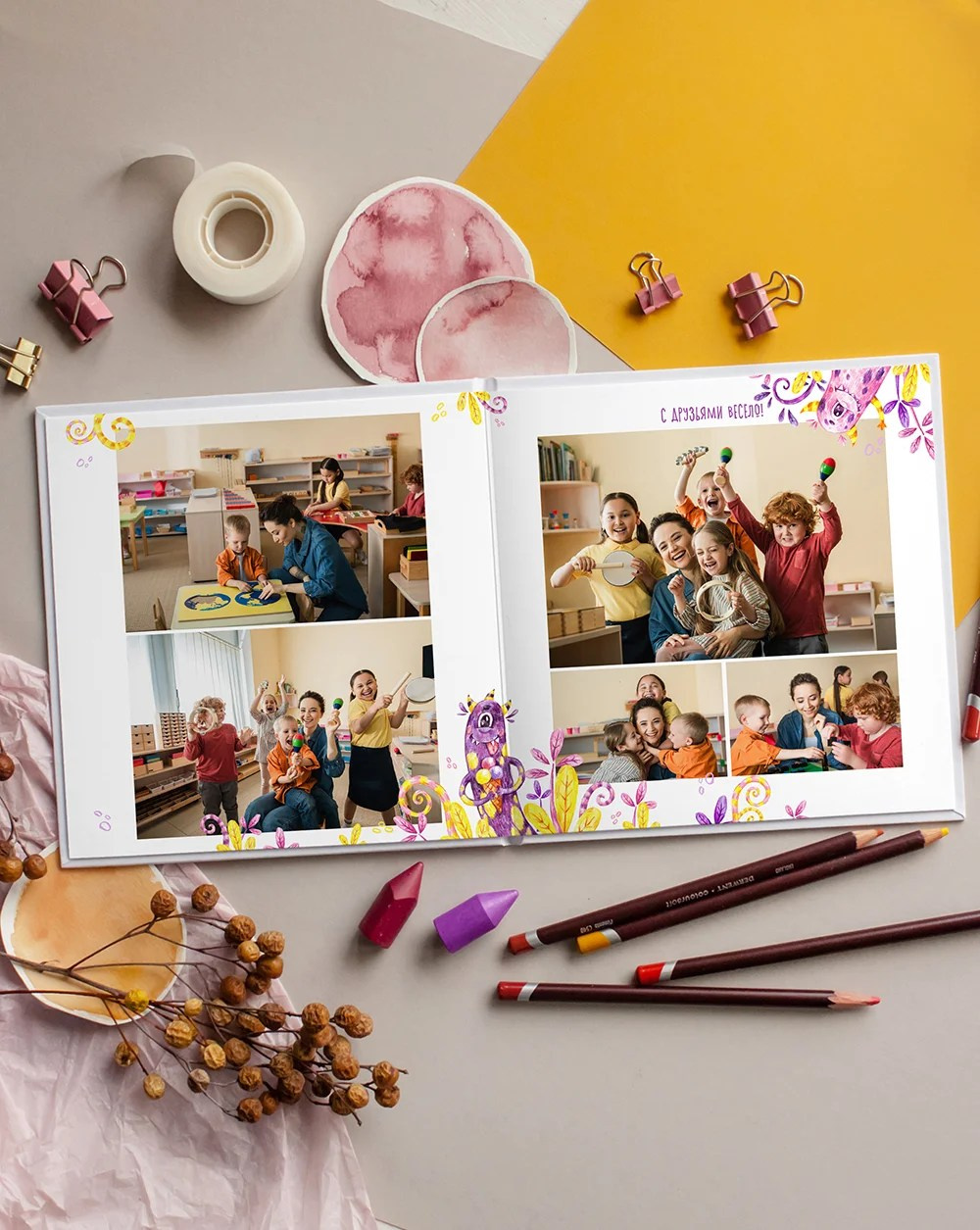 Фото на желтом фоне сделают альбом с этим дизайном ярче. Да и любой другой фон впишется отлично!