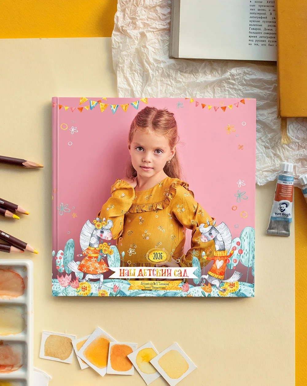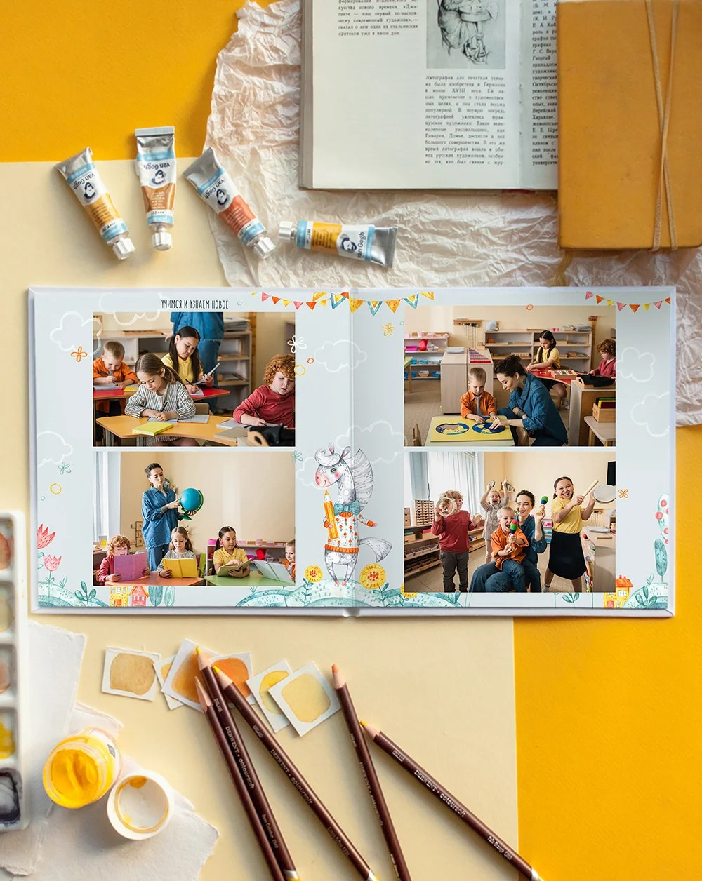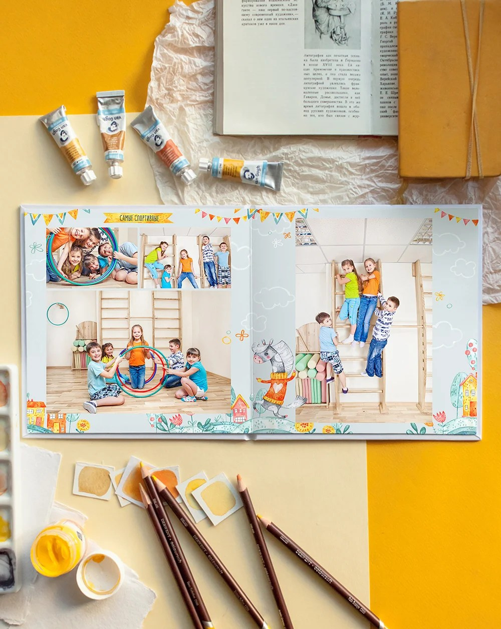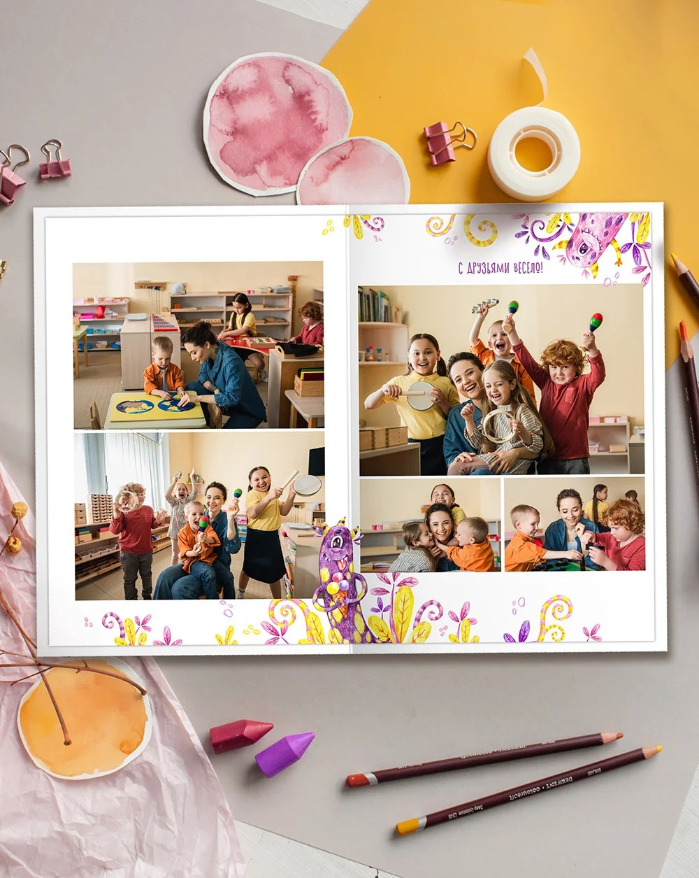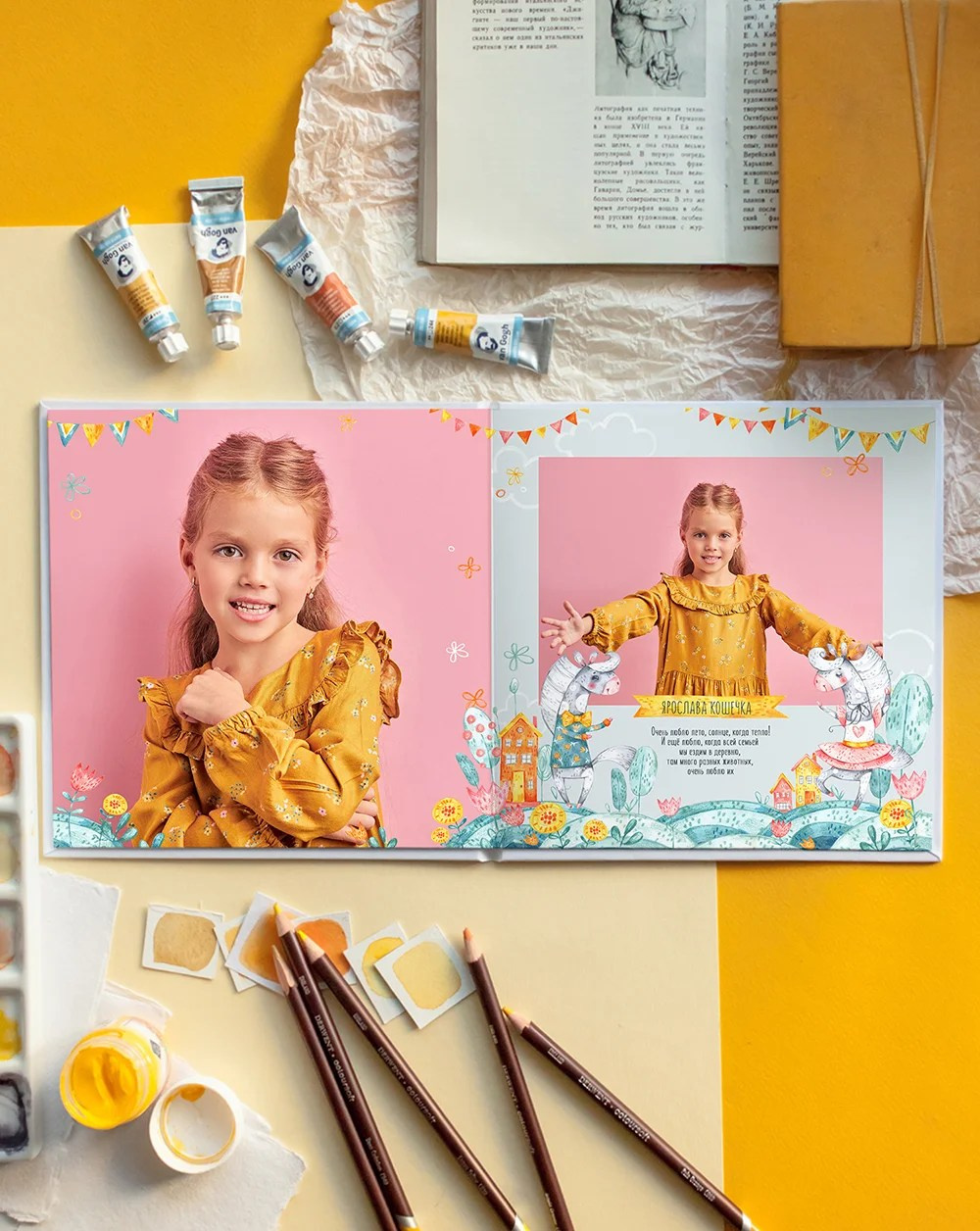 Фото на желтом фоне сделают альбом с этим дизайном ярче. Да и любой другой фон впишется отлично!