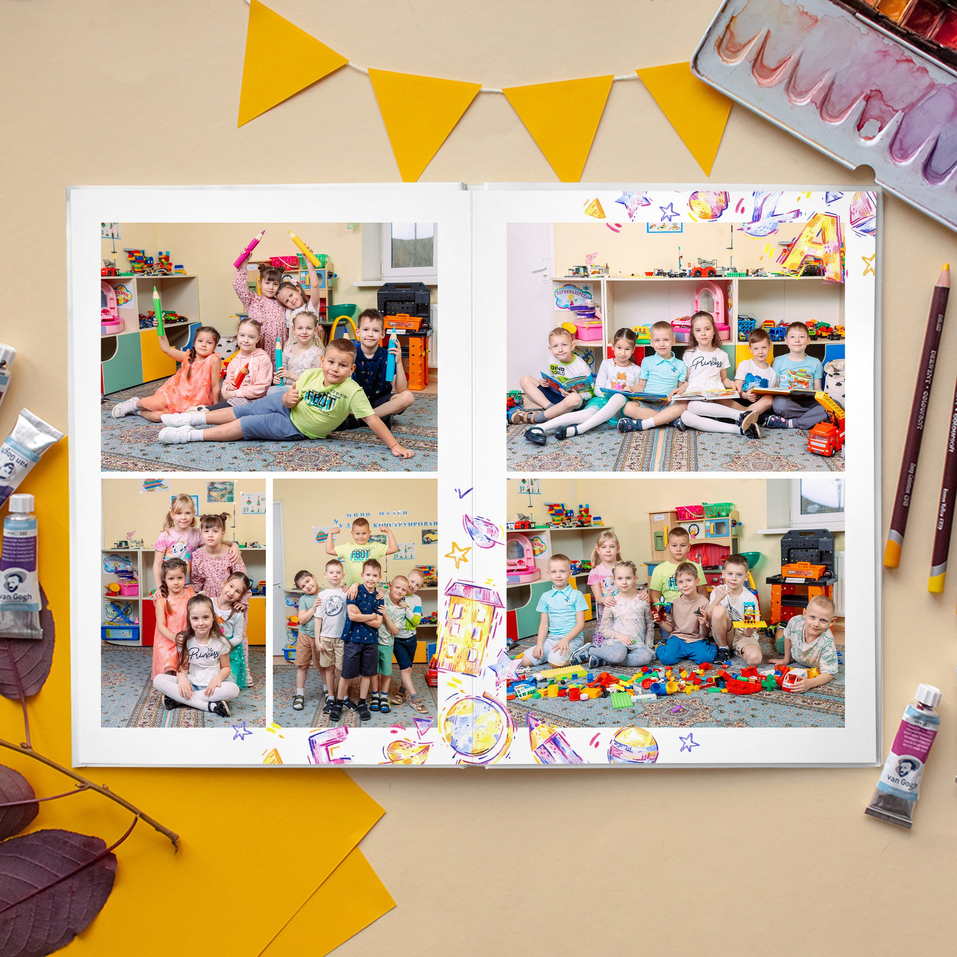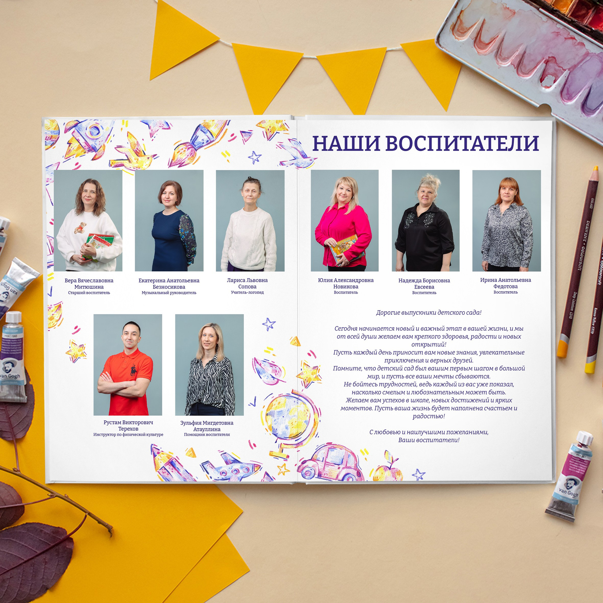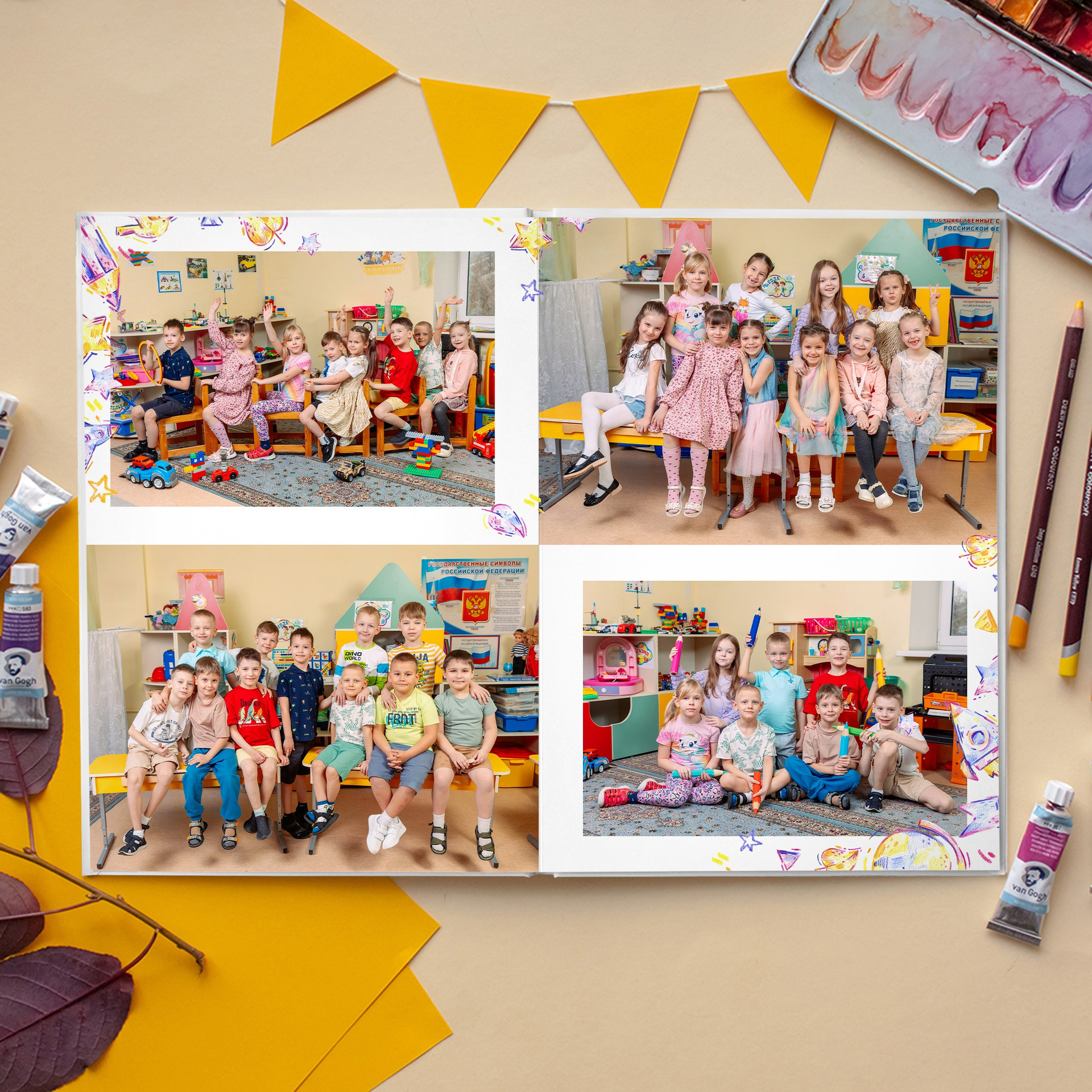 Дизайн альбома — «Рисунки». Обложка — с портретом выпускника, 1 разворот — индивидуальный, 2-13 развороты — единые для всех: портреты воспитателей и сотрудников сада с пожеланием, портреты всех детей и два сюжета — занятия и игры в группе; спортивные занятия в физкультурном зале.