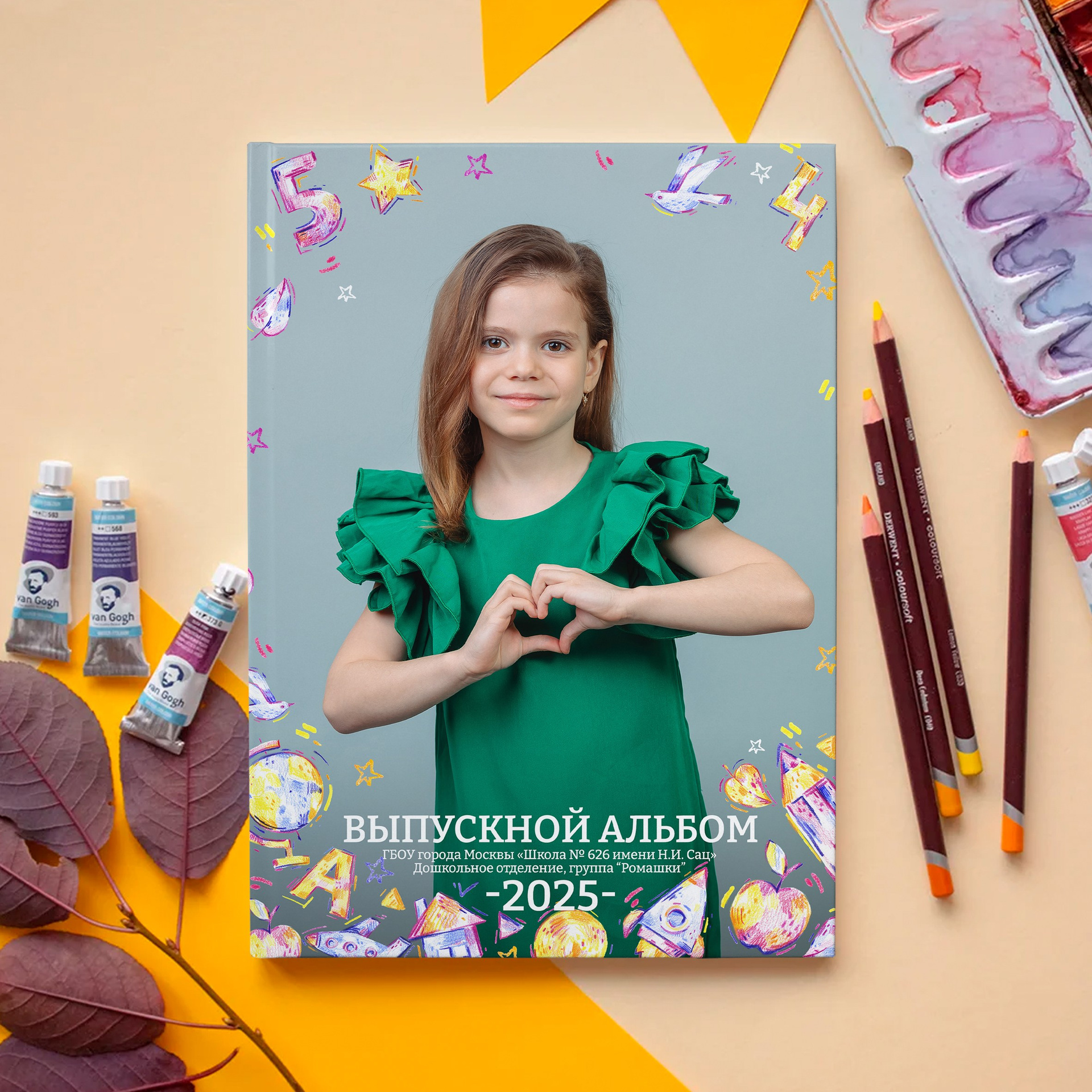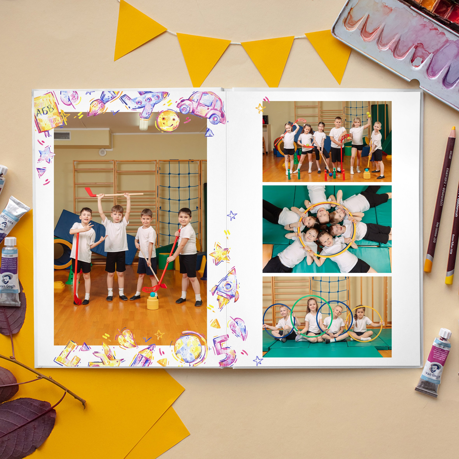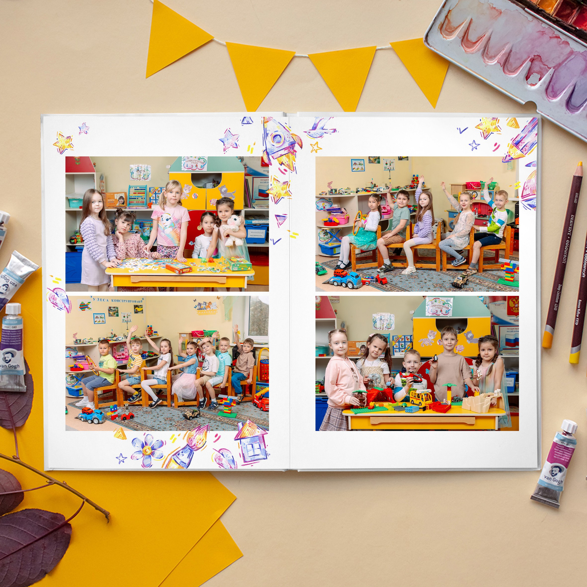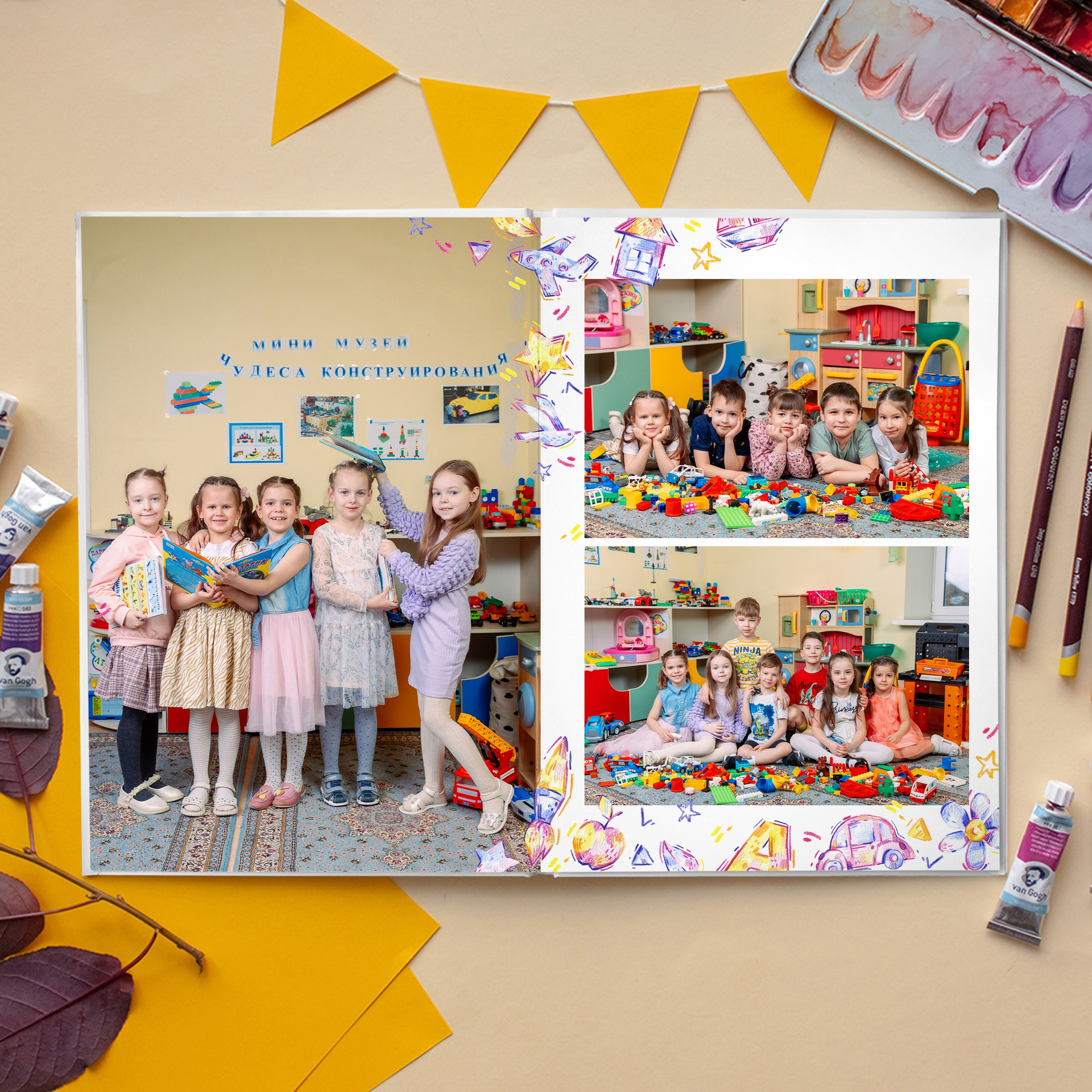Дизайн альбома — «Рисунки». Обложка — с портретом выпускника, 1 разворот — индивидуальный, 2-13 развороты — единые для всех: портреты воспитателей и сотрудников сада с пожеланием, портреты всех детей и два сюжета — занятия и игры в группе; спортивные занятия в физкультурном зале.