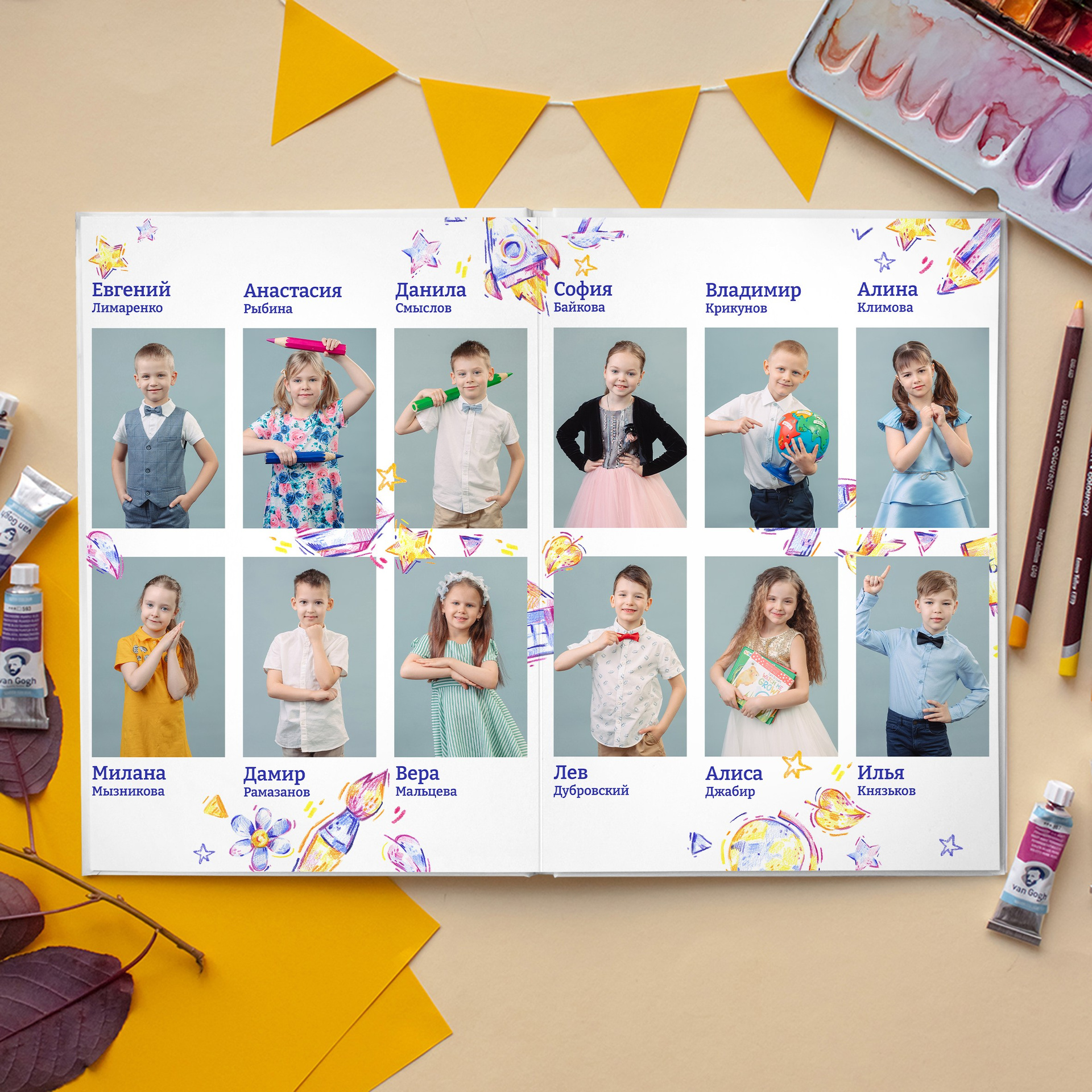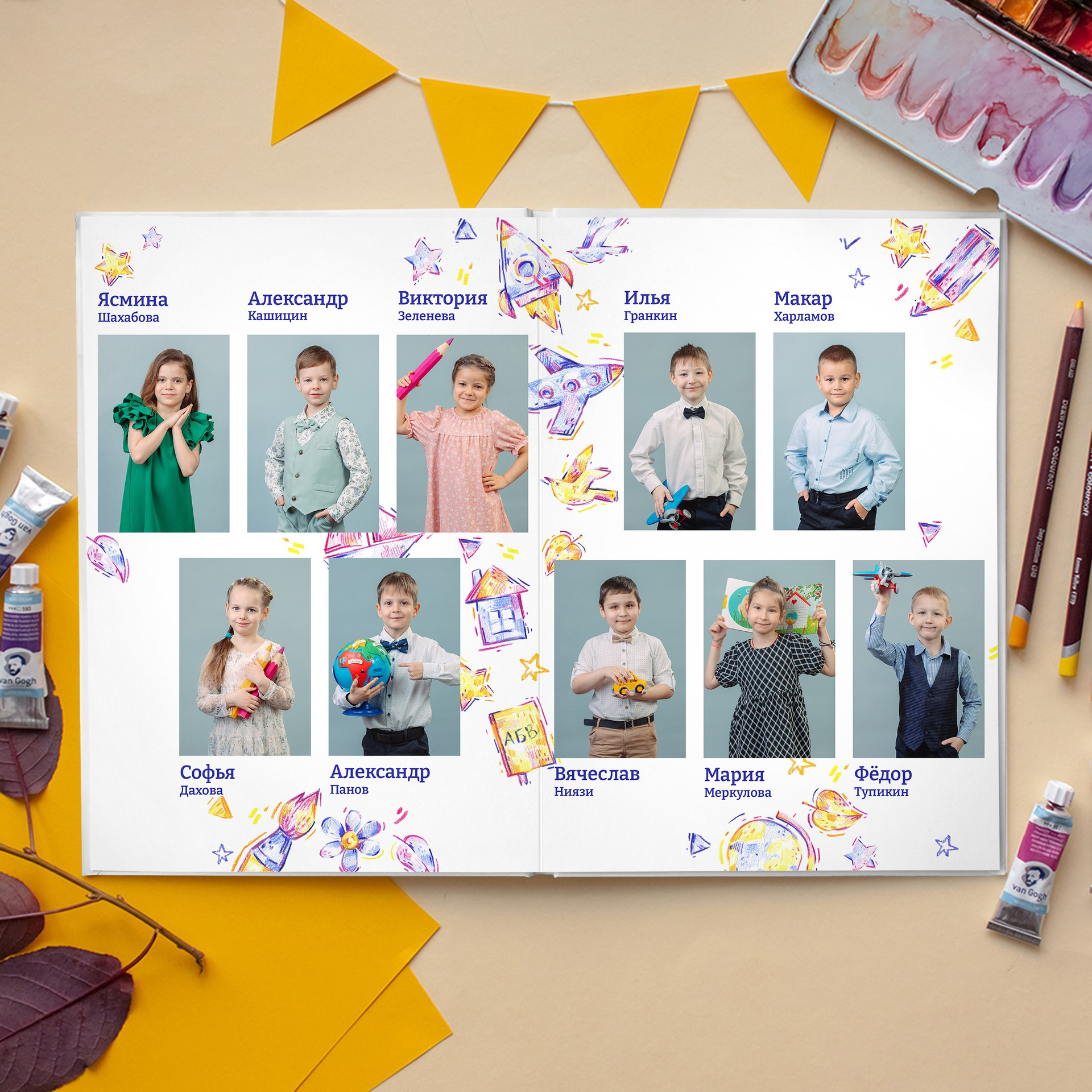 - Разворот с портретами всех детей и преподавателей, которые пришли на съёмку.