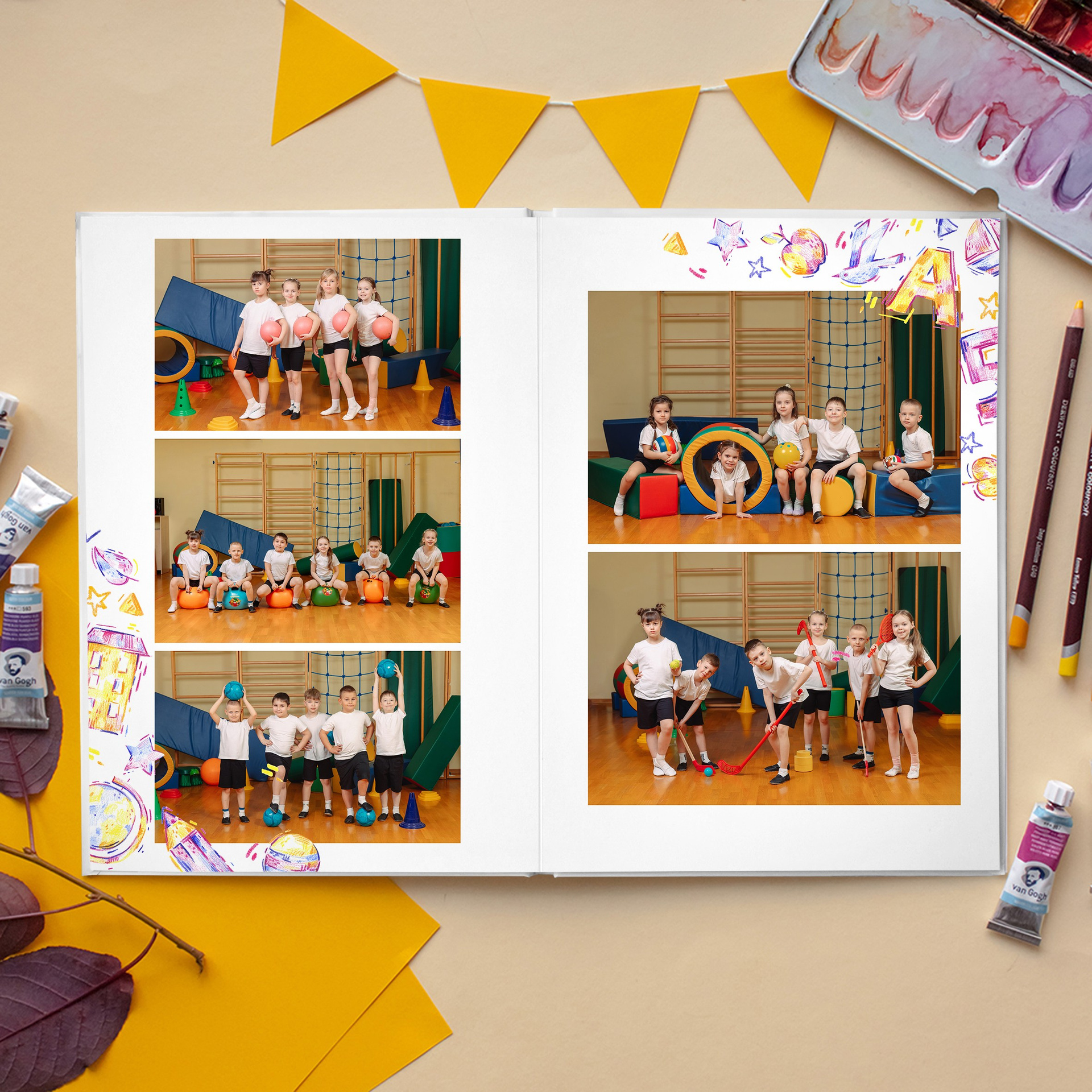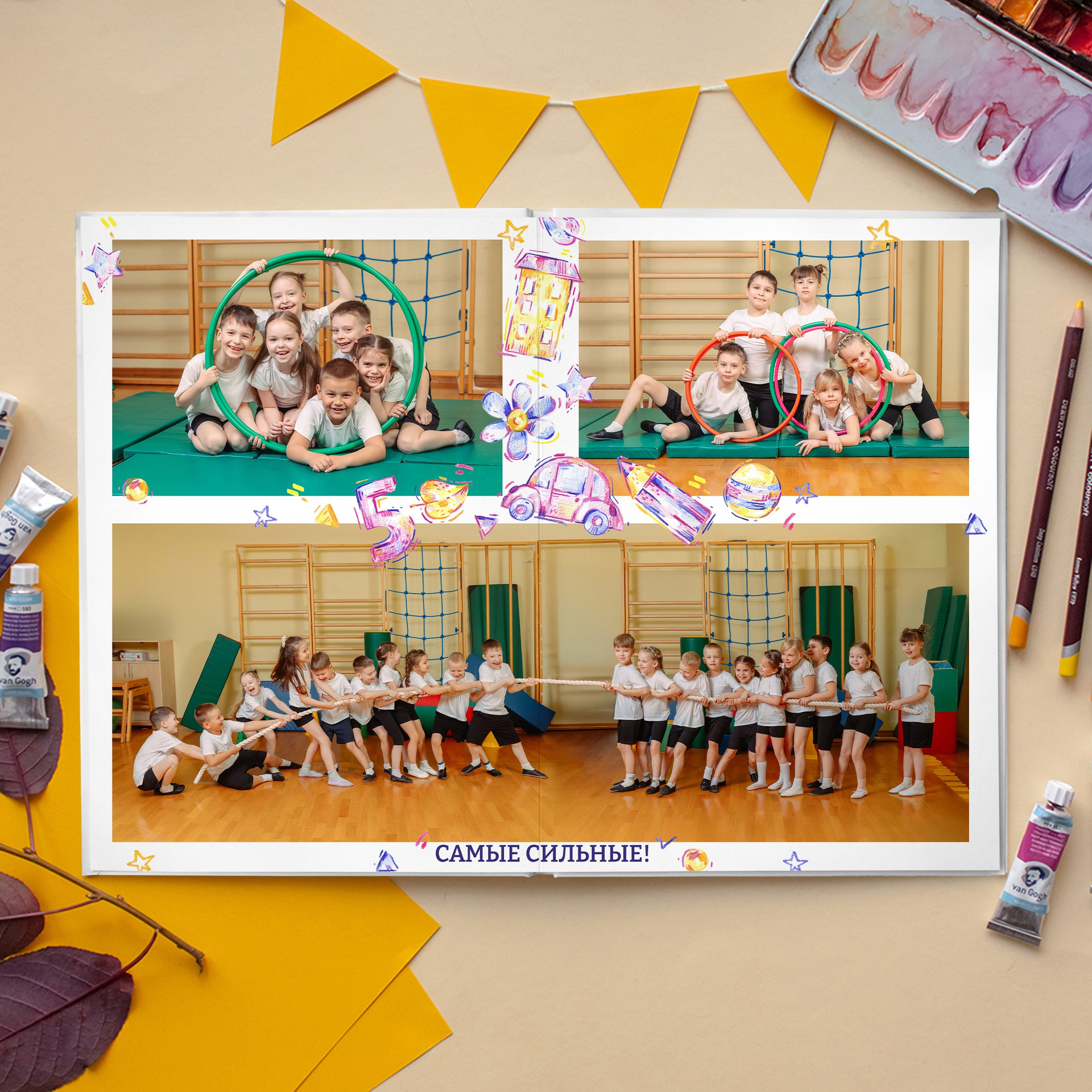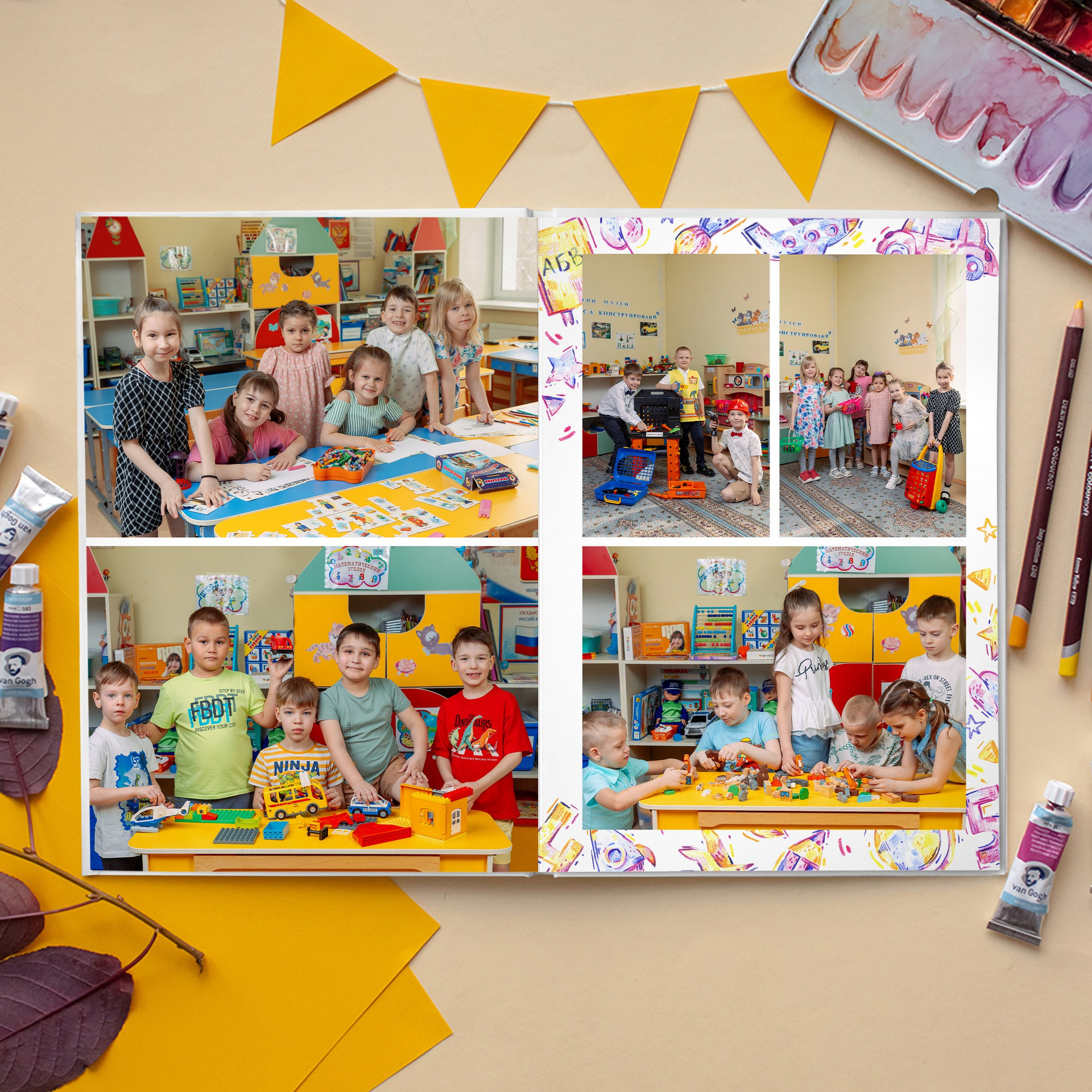 - Развороты с групповыми фото в группе (с друзьями, с воспитателем, игровые моменты), фото режимных моментов — физкультура, прогулка или другие занятия