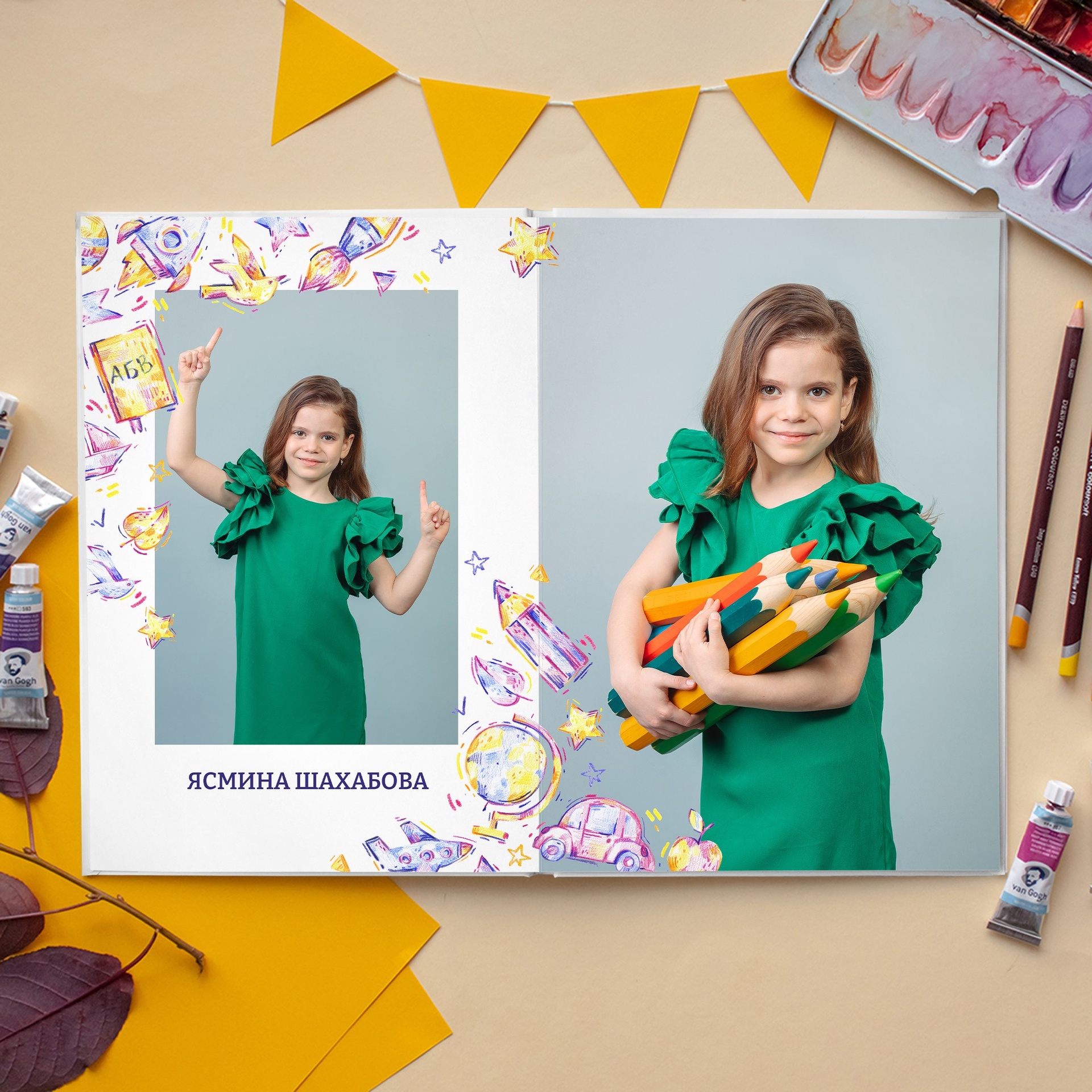 - 1 разворот индивидуальный — портреты выпускника студийном фоне (цвет фона согласовываем к дизайну), есть возможность добавления цитаты